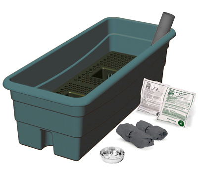 EarthBOX Junior green organic garden kit is self watering with a 1.15 gallon water reservoir. Features 1 cu. ft. soil capacity. Includes 1/2 lb. 8-3-5 organic fertilizer, 1/2 lb. organic dolomite, aeration screen, water tube, 2 black/white reversible mulch covers and water overflow saucer. Ideal size for urban dwellers and indoor herb and kitchen gardens. Made from recyclable UV stabilized plastic.