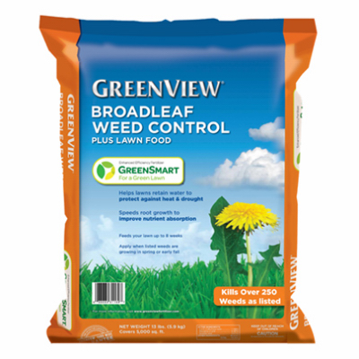 GreenView® 13 lb. Weed and Feed. It covers 5,000 sq. ft. This granular lawn care product kills over 250 weeds as listed on the label. It has time released nitrogen for extended feeding for up to 8 weeks, promoting quick green up without burning the lawn. It restores nutrients to the soil and helps the lawn retain water to protect against heat and drought. Do not use on St. Augustine grass in Florida, or on Dichondra and Carpetgrass as serious lawn injury will result. For use on established bahiagrass, bermudagrass, buffalograss, centipedegrass, fine fescues, Kentucky bluegrass, perennial ryegrass, tall fescues, and zoysiagrass.